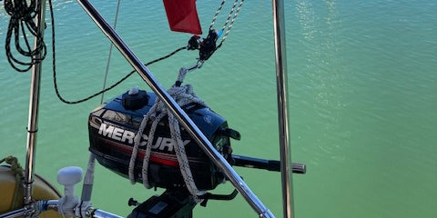 It took a couple of discussions to work out the best choice of pulley blocks for this outboard motor hoisting system, in the end we settled on two blocks which give a 3:1 mechanical advantage, and incorporate a cam-cleat so the line can be gripped in position when needed without worry of any drops.