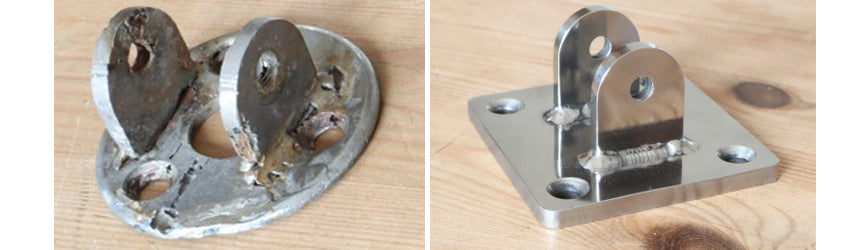 The new brackets were to be made from 316 (marine-grade) stainless steel, welded together with the TIG-welding process, and polished to finish. The TIG-welding process (using 316L filler rod) gives both a good structural connection, but just as importantly a weld which is free of oxidation during the welding process, which can the be polished along with the parent materials. Polishing for fabricated 316 stainless steel parts is a necessary part of achieving a long-lasting appearance in salt-water environments, but in order to get to the polishing stage, it is important that the TIG-welding is well-performed in the first place. This is a matter of technique and good shielding during the welding process, experience and equipment selection are key in achieving this.