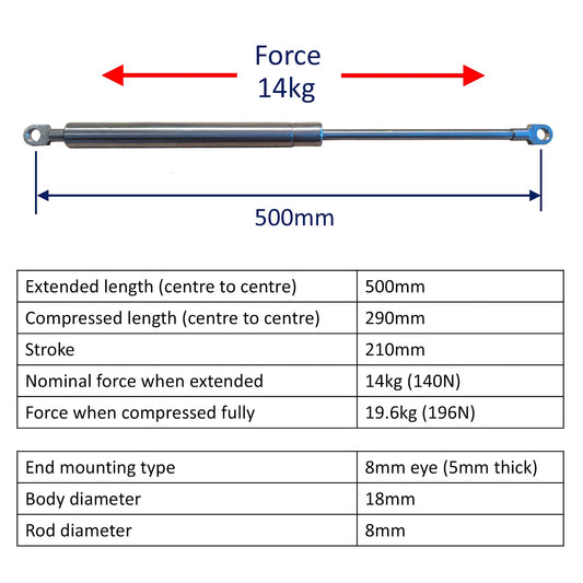 • Replacement Gas Strut / Gas Spring – Osculati – Marine-Grade Stainless Steel – 8mm Plain End Bearings - 500mm – 14kg (140N)