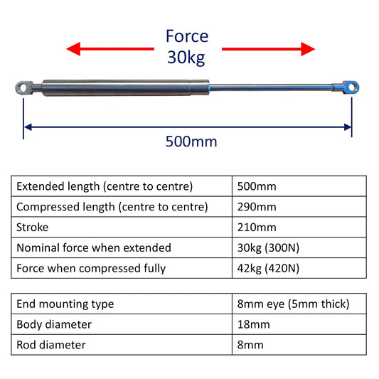 • Replacement Gas Strut / Gas Spring – Osculati – Marine-Grade Stainless Steel – 8mm Plain End Bearings - 500mm – 30kg (300N)