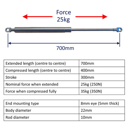 • Replacement Gas Strut / Gas Spring – Osculati – Marine-Grade Stainless Steel – 8mm Plain End Bearings - 600mm – 30kg (300N)