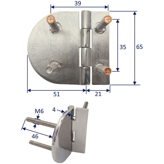 • Polished Stainless Steel Hinge 75x39mm With Hidden Fixings (Threaded Studs M6 x 45mm)