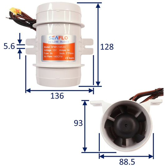 • SEAFLO In-Line Bilge Blower / 12 Volt / Vertical or Horizontal Installation, Air Ventilation Pump / Air Flow 235cfm/400cmh