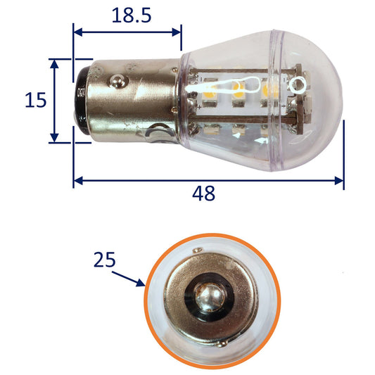 • Navigation / Interior LED Bulb, BA15S Fitting, Warm White, 127 Lumen, 11W, 10-30V DC, Bayonet Fitting Single Contact Base, 15 LED