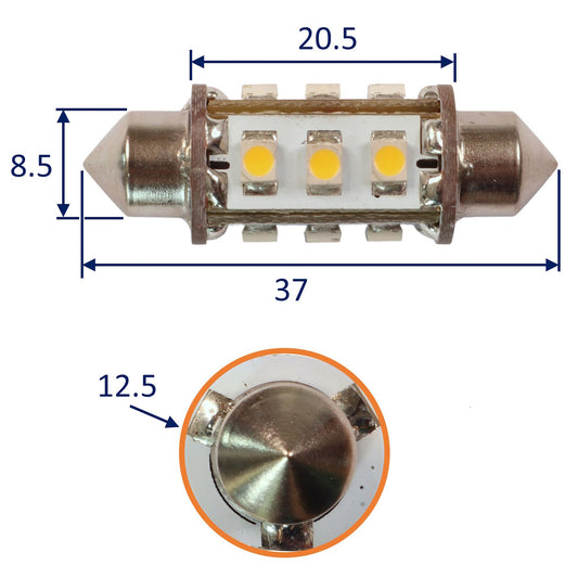 • Festoon LED Bulb, SV8.5 Fitting, Warm White, 90 Lumen, 8W, 10-30V DC. 12 LED, 37mm Length