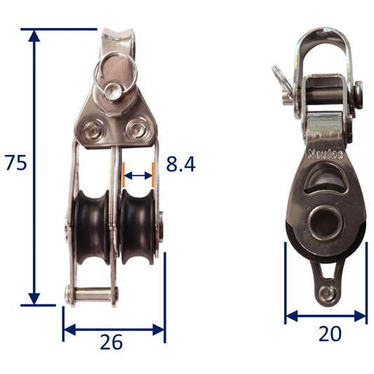 • Double Fixed Pulley Block With Becket & 20mm Sheave, 316 Stainless Side Plates, Miniox
