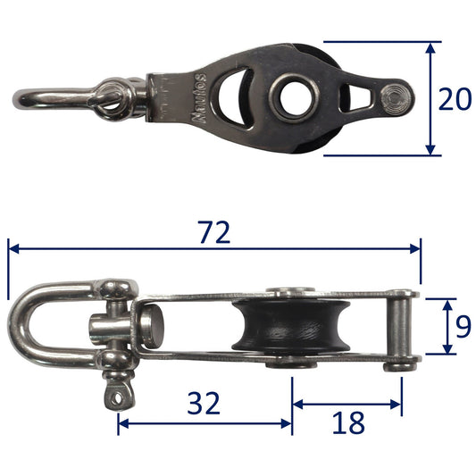 • Single Swivel Pulley Block With Becket & 20mm Sheave, 316 Stainless Side Plates, Miniox