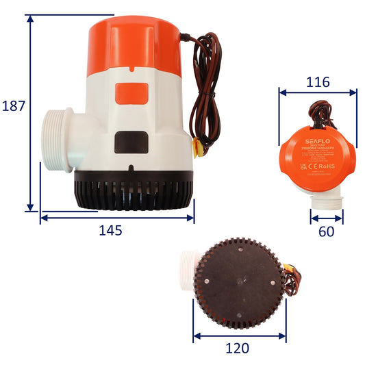 • SEAFLO 3700 GPH Electric Bilge Pump / Non-Automatic / Submersible Pump / 12Volt / 13A Series