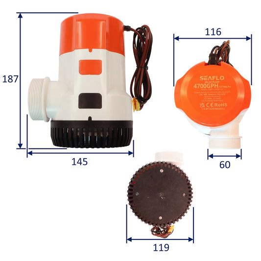 • SEAFLO 4700 GPH Electric Bilge Pump / Non-Automatic / Submersible Pump / 12Volt / 16A Series