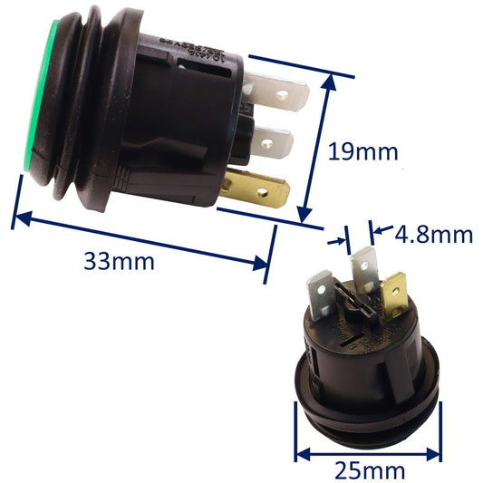 • Waterproof 12V/24V Push Switch 10Amp Current Capacity, With Green LED Illumination
