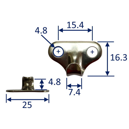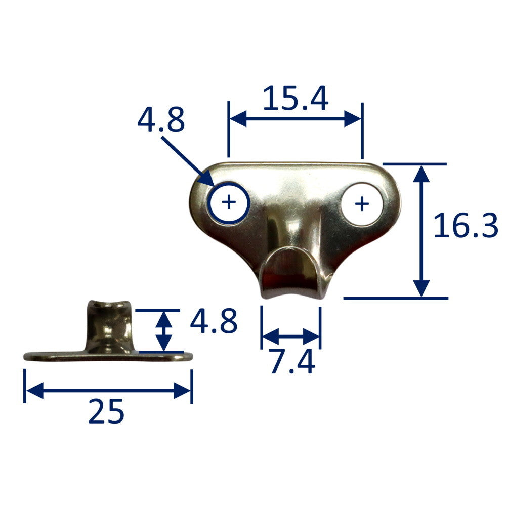 Boat canopy hook (lacing hook) made from 316 stainless steel.  These have 2 holes in a horizontal arrangement keeping the overall height compact and strong.  Lacing hooks can be secured to masts, booms or directly to your fibreglass or wooden deck.