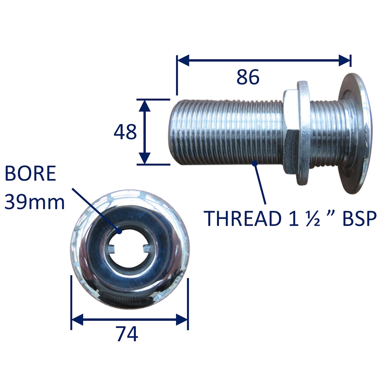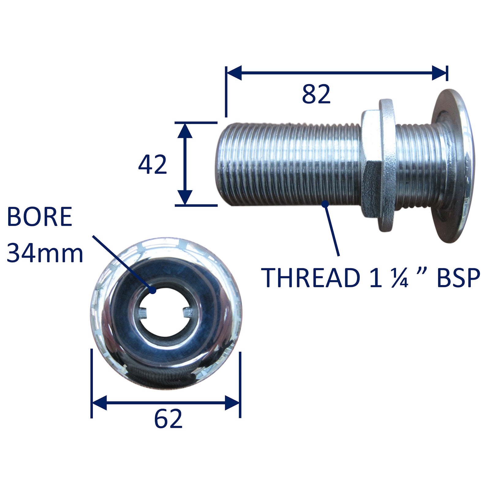 Boat hull skin fitting / hose inlet fitting / hose outlet fitting manufactured in 316 (marine grade) stainless steel. These come in a range of thread sizes from 3/8 to 1 1/2” BSP