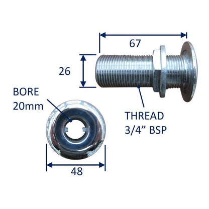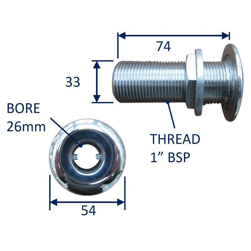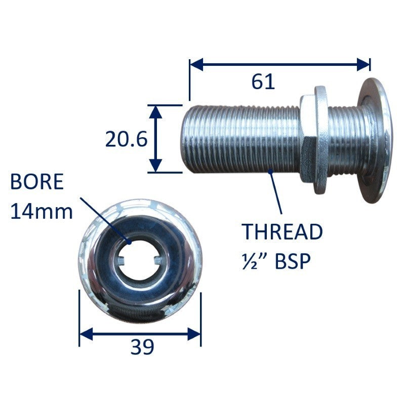 Boat hull skin fitting / hose inlet fitting / hose outlet fitting manufactured in 316 (marine grade) stainless steel. These come in a range of thread sizes from 3/8 to 1” BSP
