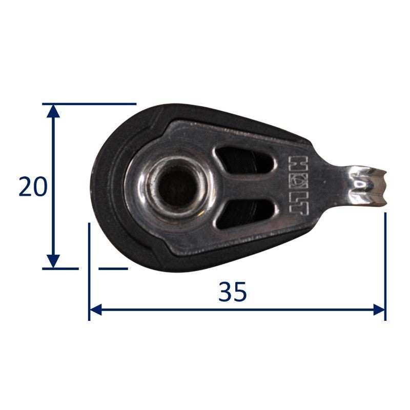 Sailing pulley block, Holt Dynamic 20mm single fixed block. Running on stainless steel ball bearings for high performance in a compact product.