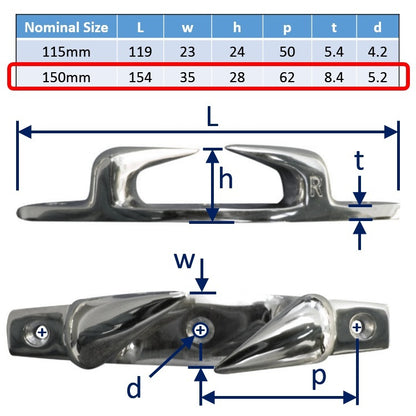 These boat fairleads come in two sizes, 115mm in length and 150mm length.  The 115mm length fairleads are suitable for rope sizes up to 12mm diameter.  For ropes up to 14mm in diameter choose the 150mm length fairleads.