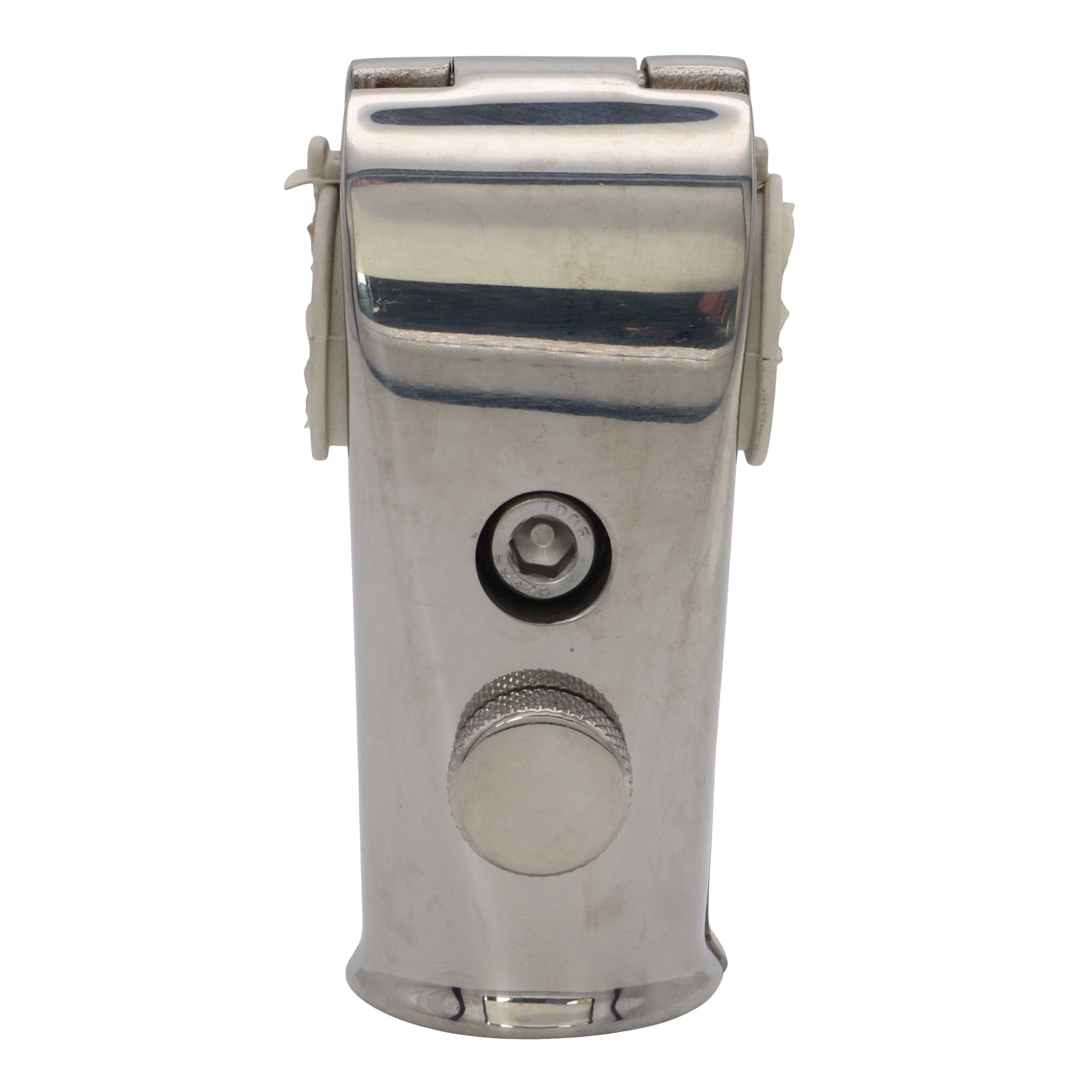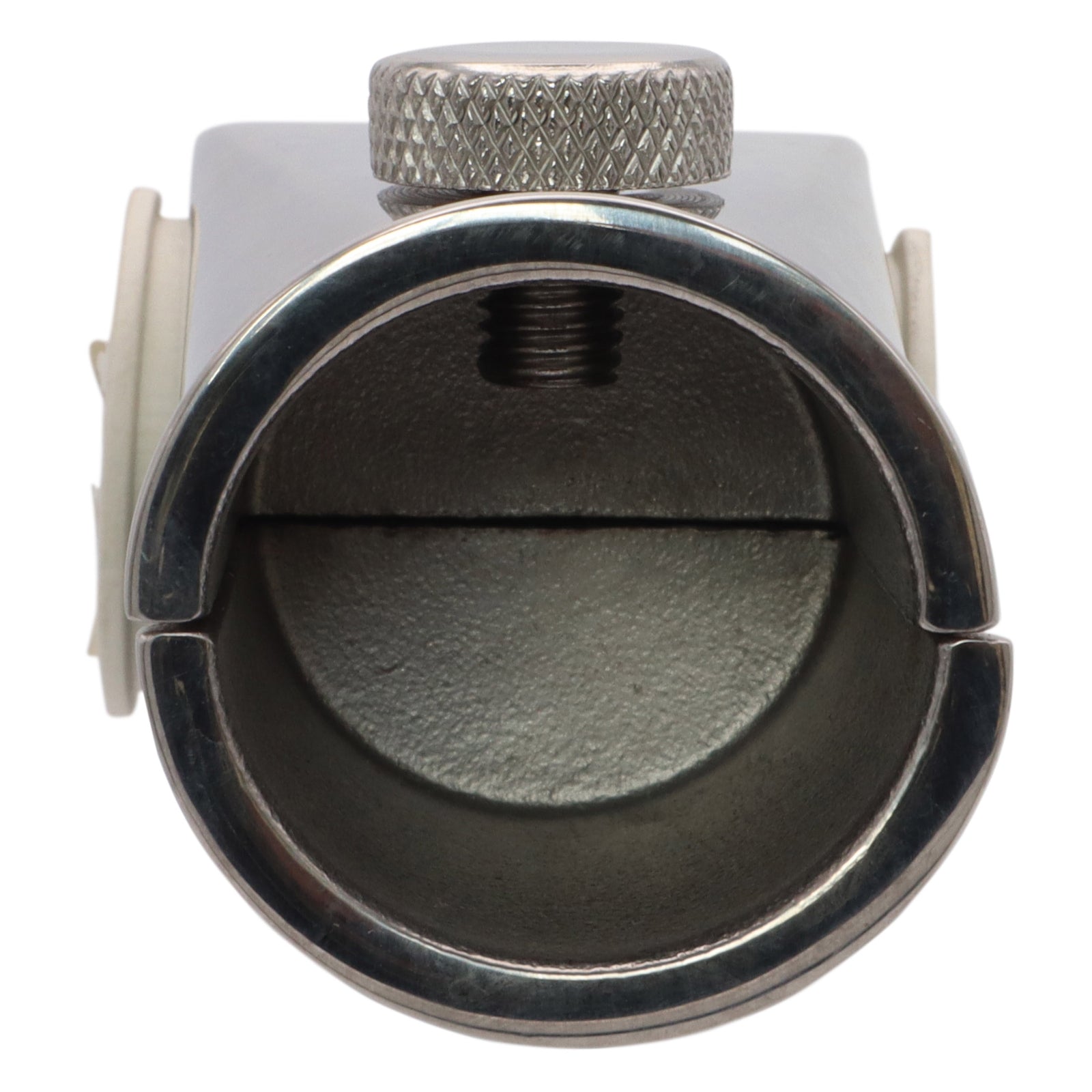 Flag pole mounting socket for attaching to your pushpit, this can mount to 22mm or 25mm tubing (a white rubber shim is used for 22mm tubing).  This flag pole mount exudes quality and is made from polished 316-grade stainless steel.  The flag pole is secured in place with the supplied thumb screw.