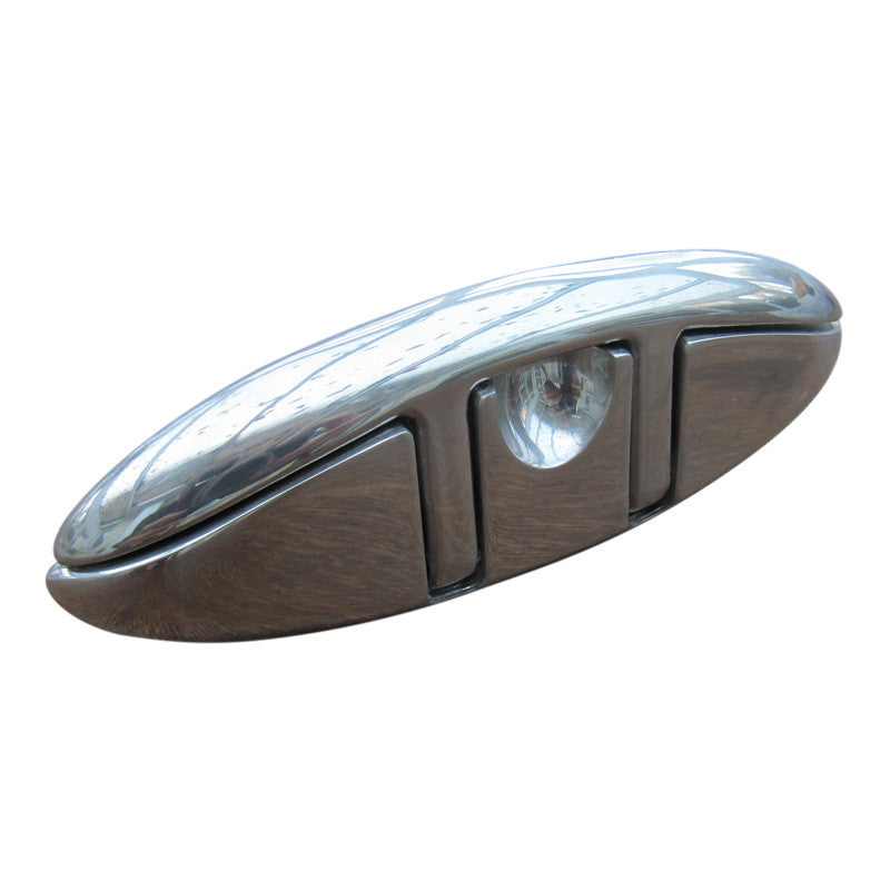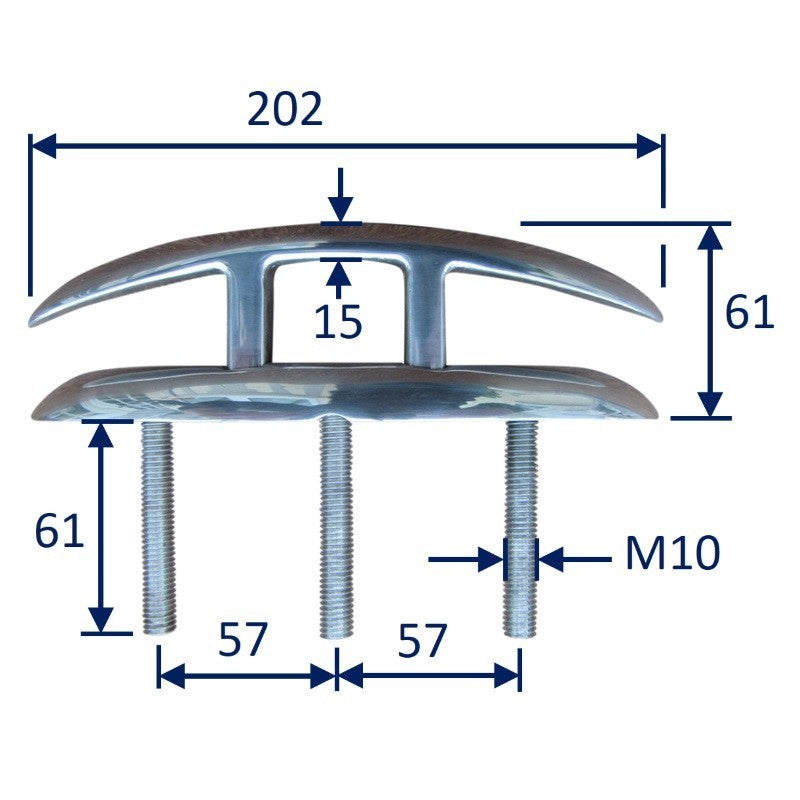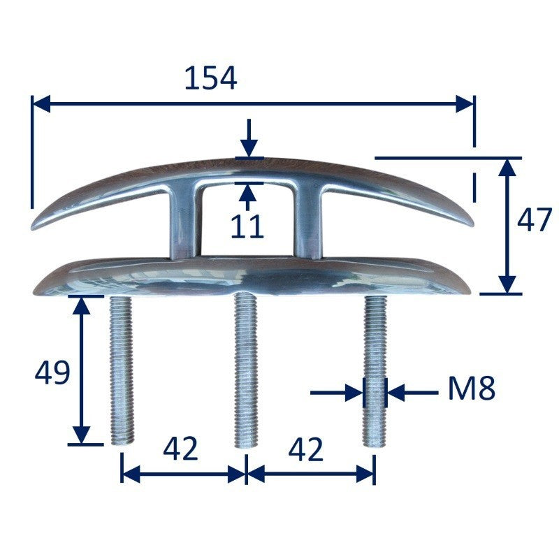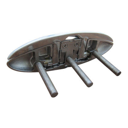 Folding boat deck cleat, manufactured from 316 stainless steel. These have a polished finish and include fixing studs with washers and nuts. These folding boat deck cleats have a sprung action to keep them in place when closed or open.