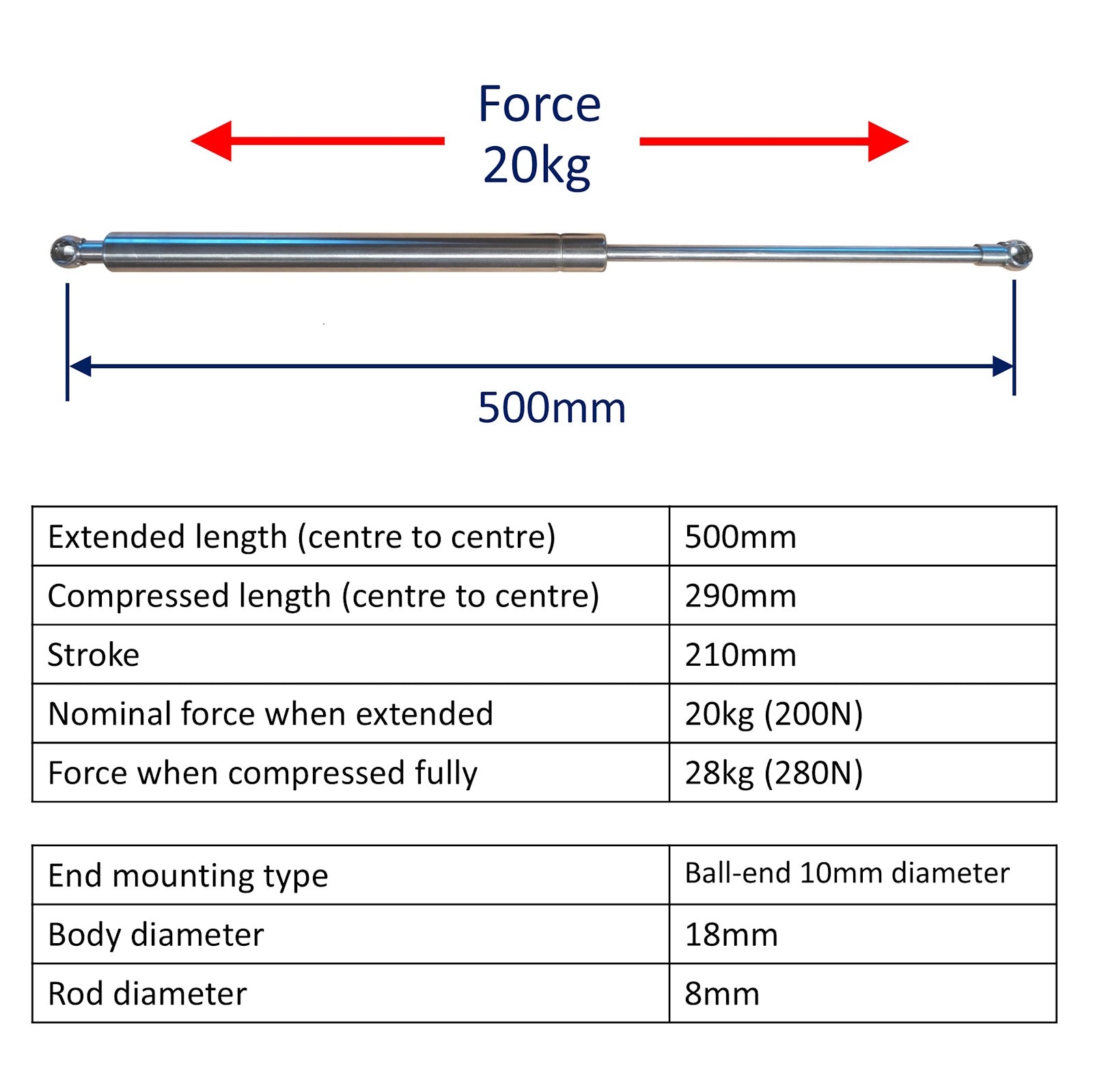 Gas Strut / Spring – 10mm Spherical Bearings - 500mm – 20kg (200N) - Osculati – Marine-Grade Stainless Steel