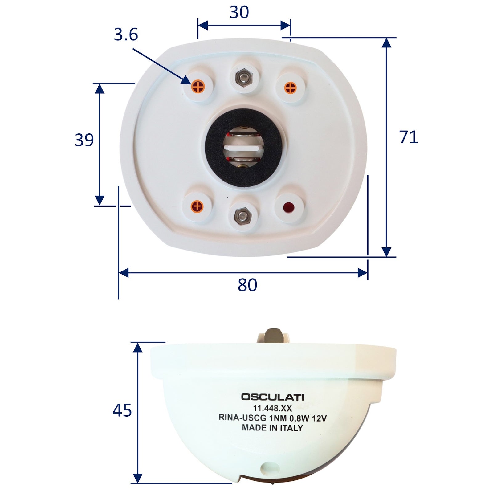 Protruding out of the back panel are 2 spade connectors for easy connection of your electrical wires.  Four mounting holes are provided in the back panel of this navigation light on a 39 x 30mm pattern.
