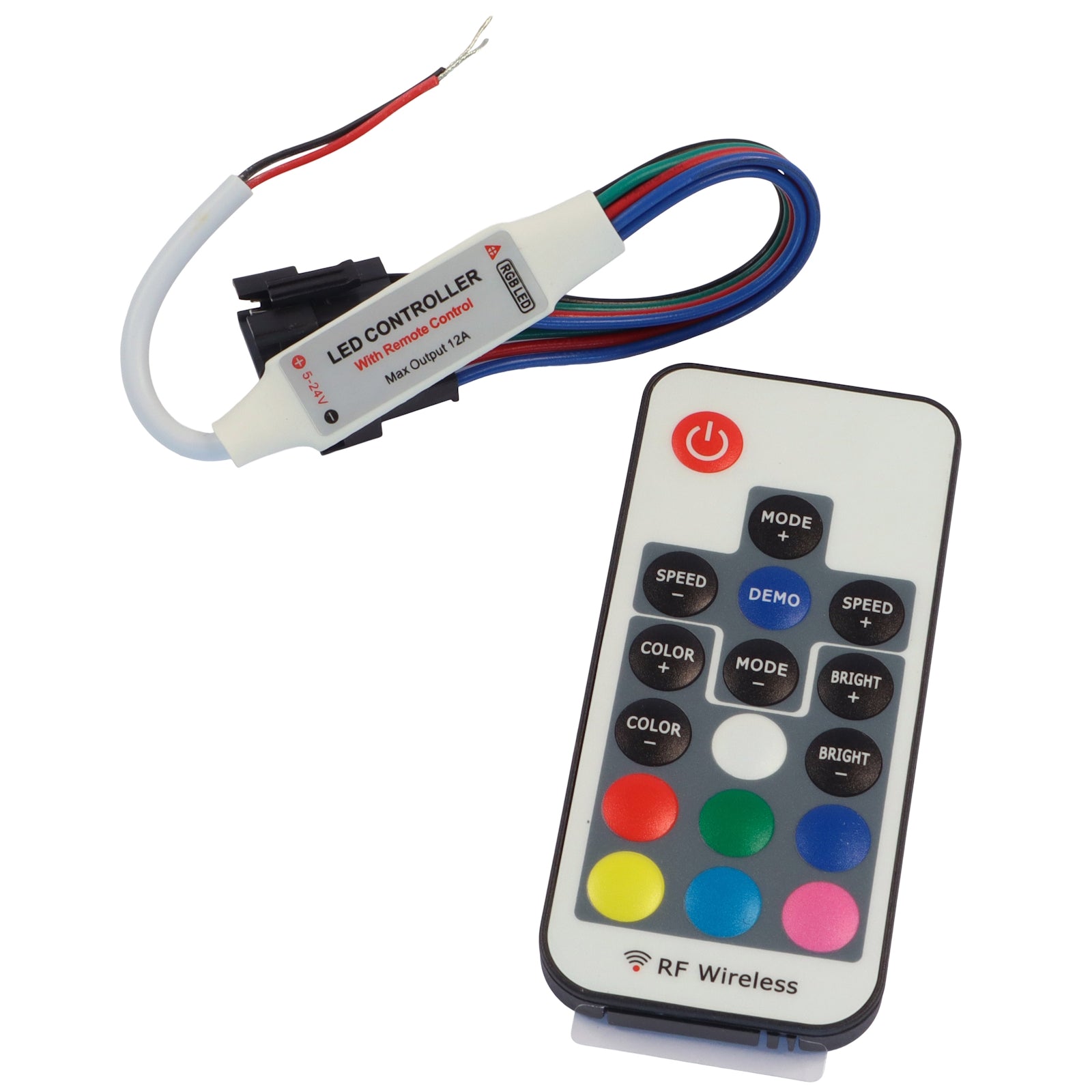 The RGB multi-coloured LED lights controlled by a battery-powered remote control unit, which is included.  There are many modes of operation including varying colours, brightness, dynamic mode and adjustable speed.  The signal from the remote can pass through most materials.