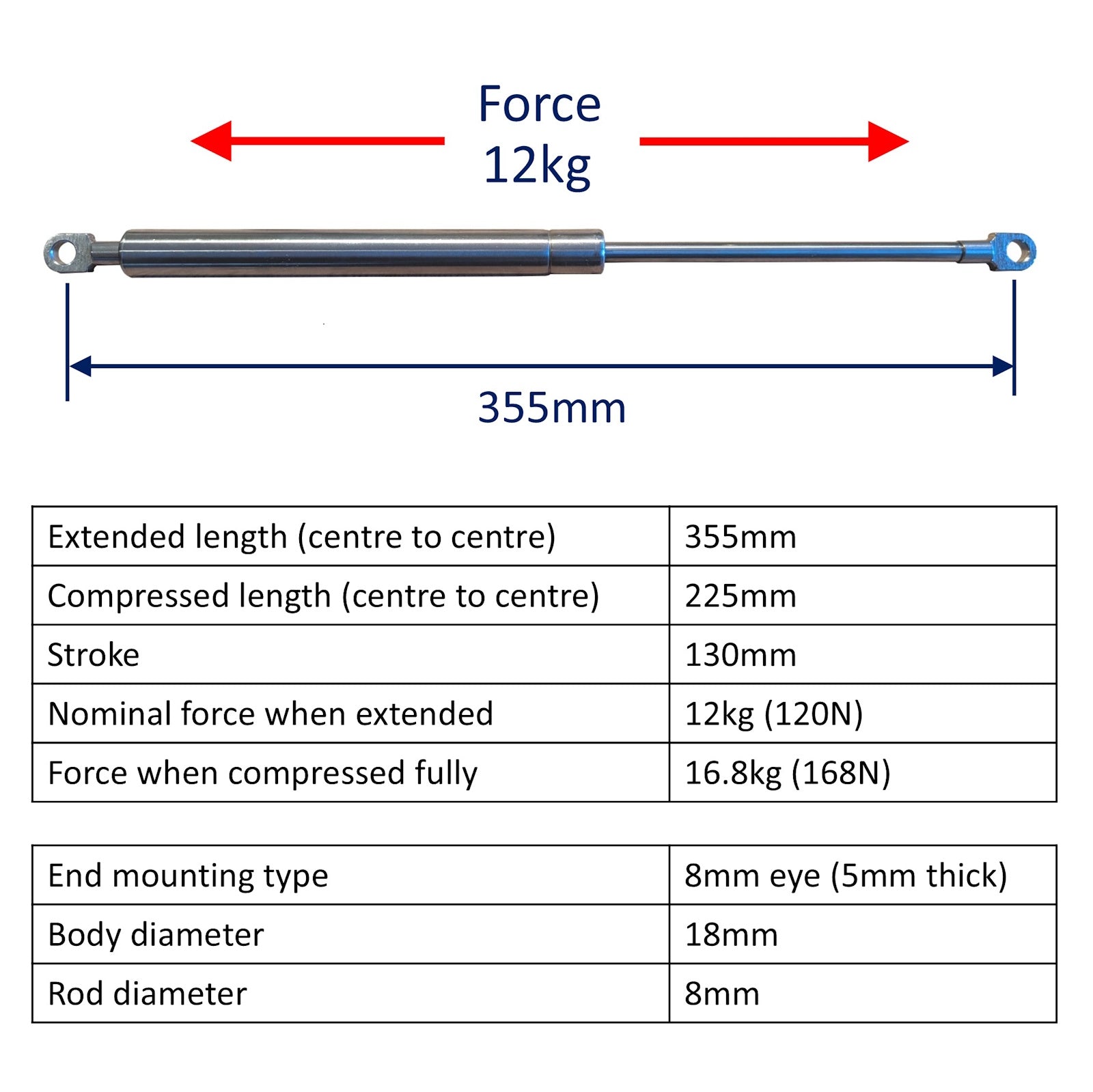 •    Nominal force when fully compressed 16.8kg (168N)