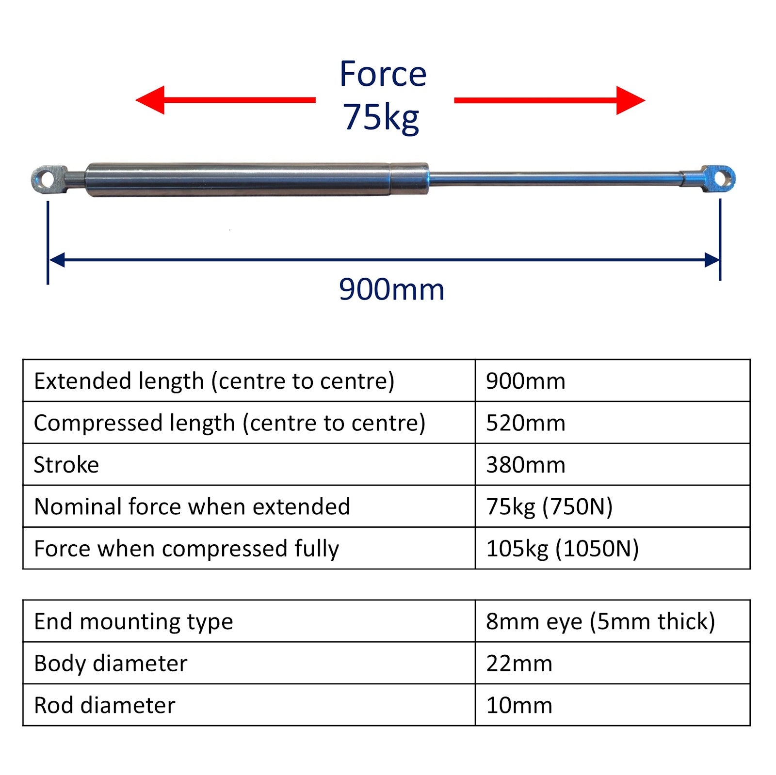 •    Nominal force when fully compressed 105kg (1050N)