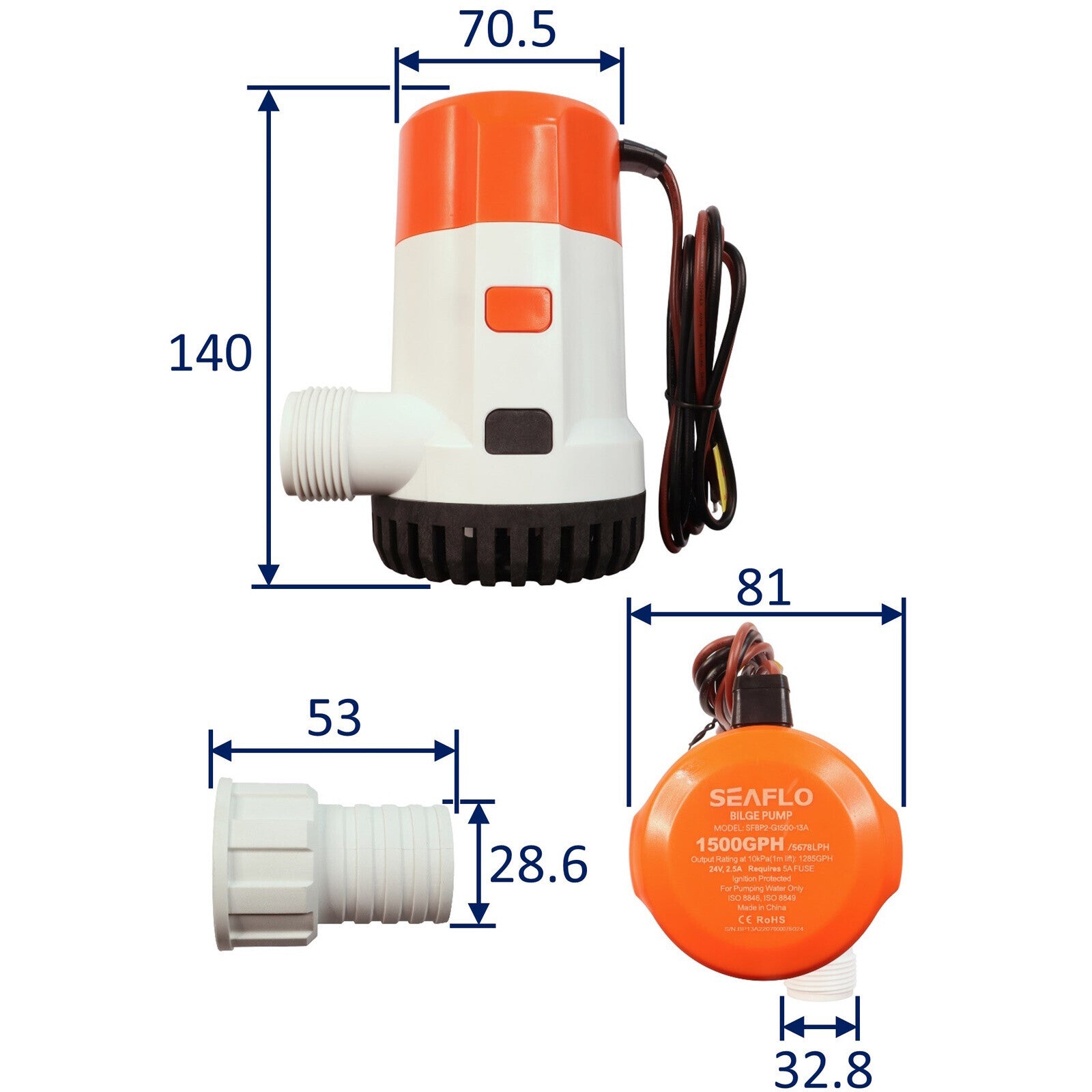 Introducing the SEAFLO 1500 GPH Electric Bilge Pump, for boat owners seeking reliable water pumping performance. Designed with versatility and efficiency in mind, this submersible pump operates on a 24 Volt power supply. With a powerful 1500 gallons per hour (GPH) capacity, it swiftly evacuates water from your boat's bilge, keeping it dry and safe. This bilge pump includes a non-return valve to prevent water in the exit pipe from flowing back into the bilge, for maximum dryness.