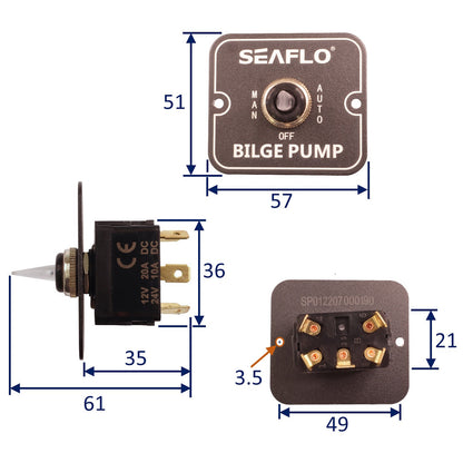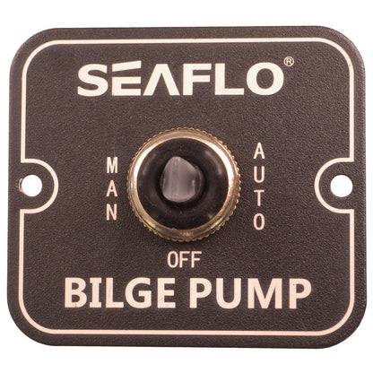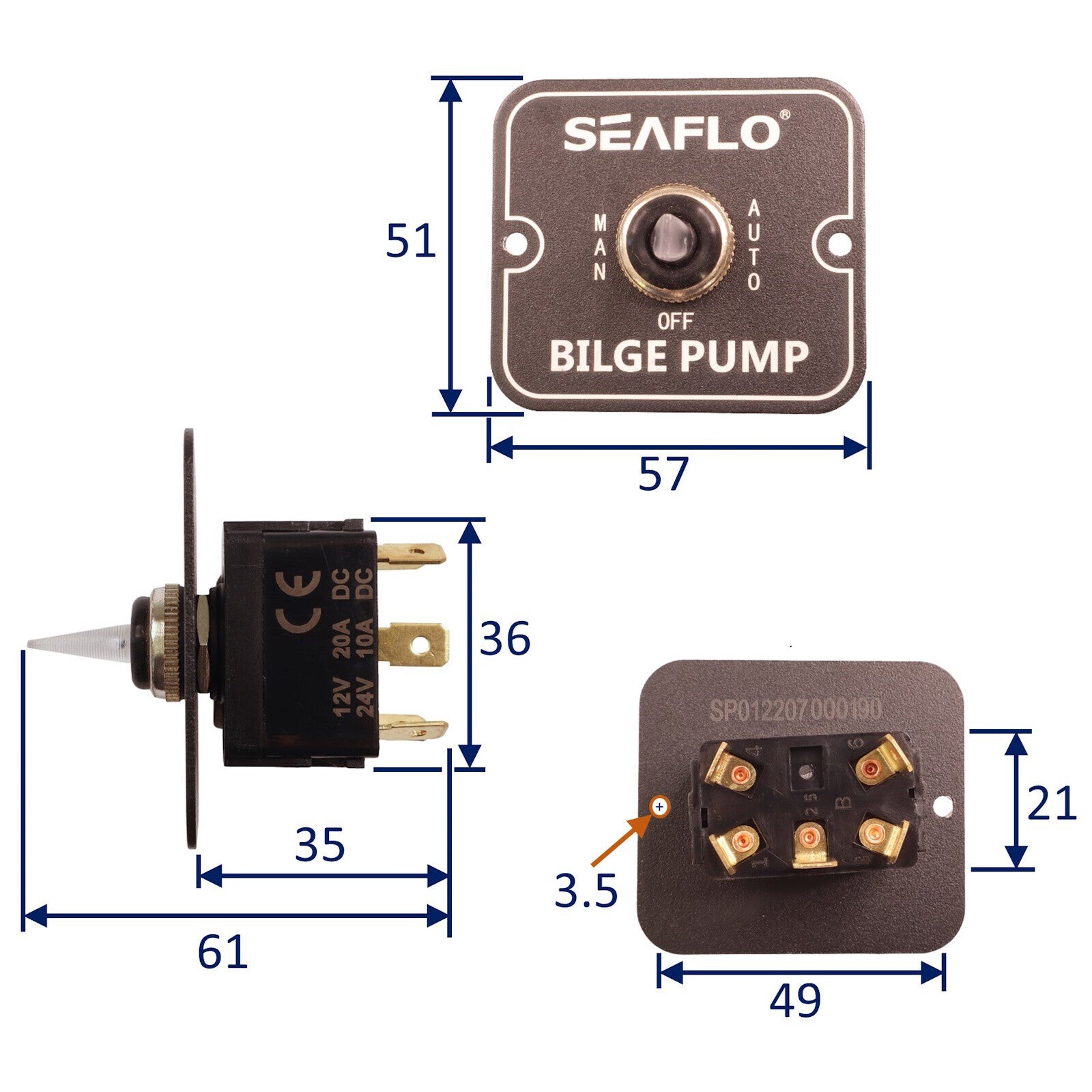Introducing the SEAFLO bilge pump switch for controlling any bilge pump equipped with a float switch. Positions of switch Manual/Off/Auto.