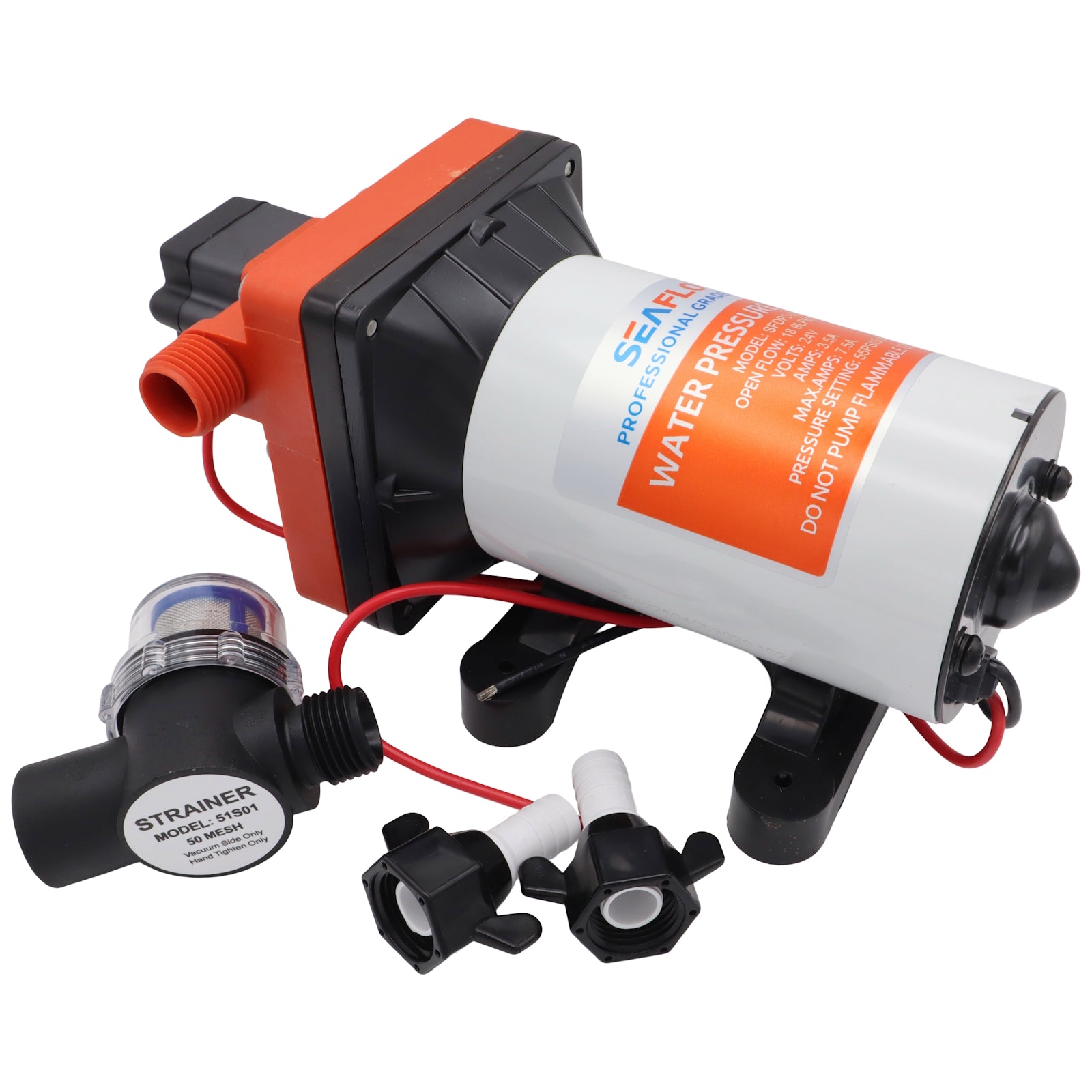 This water system pump has a built-in pressure switch, keeping your water system up to pressure and ready for you to use. Once the desired pressure is reached the pump will turn itself off automatically.  The pump comes with hose fittings and also a fine mesh filter to keep unwanted debris from entering the pump.