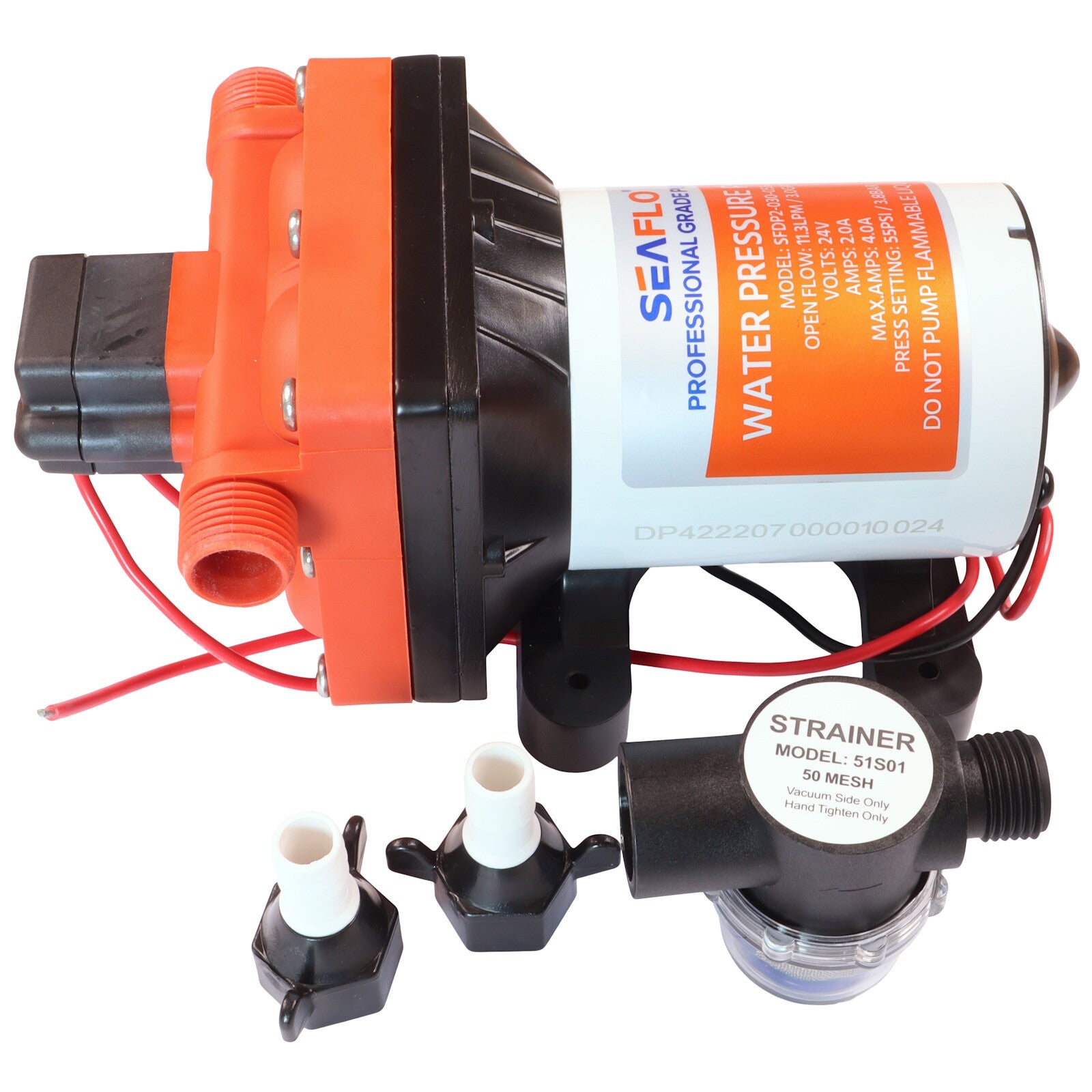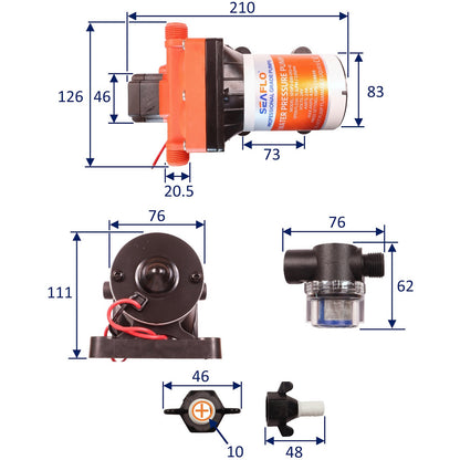 Introducing the SEAFLO water pressure pump - 42 Series, your reliable companion for a smooth water supply on the go. Designed for efficiency and convenience, this 24-volt 4-chamber diaphragm pump ensures a steady flow of water in your boat, RV, or off-grid cabin.