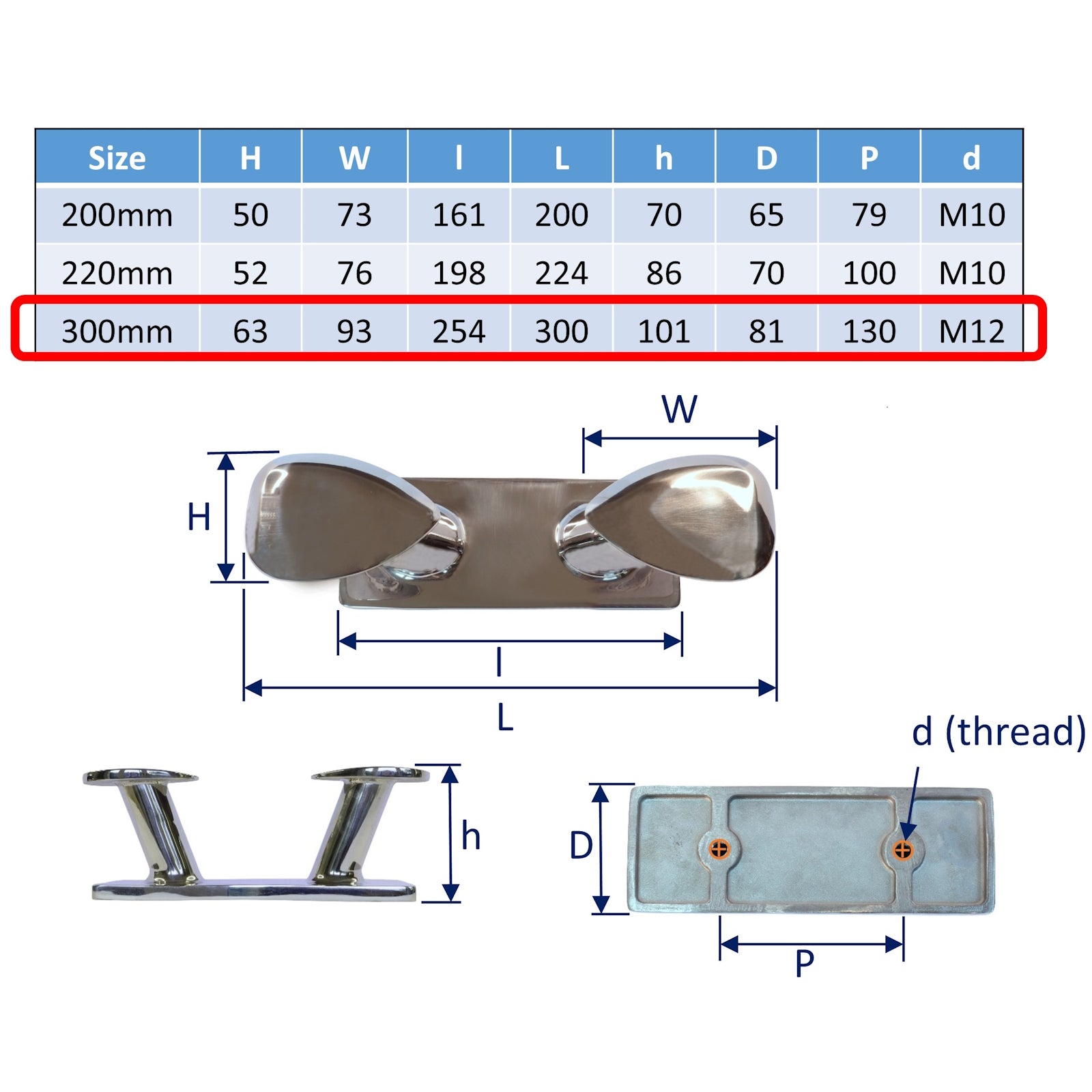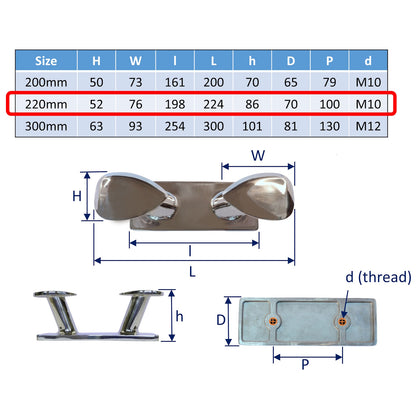 Available in three sizes, 200mm, 220mm or 300mm they can accommodate a range of rope thicknesses, making them versatile for different boats. The sleek, polished finish not only enhances its aesthetic appeal but also ensures long-lasting performance. Whether you're at the dock or offshore, this cleat is built to stand the test of time.