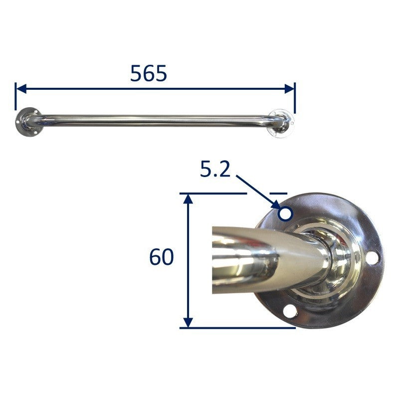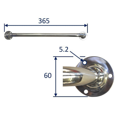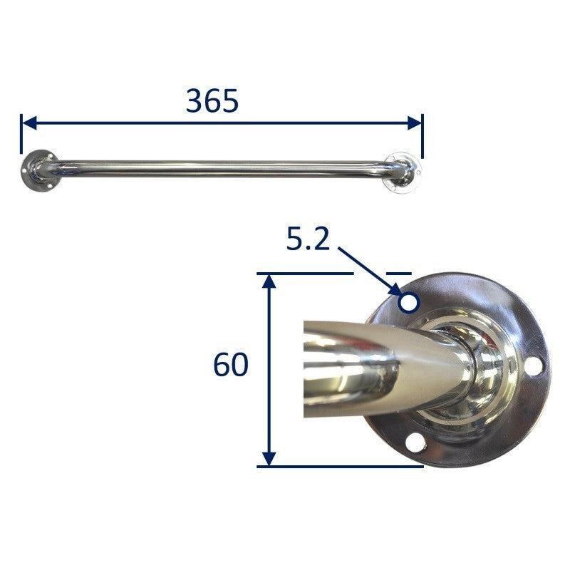 Stainless steel hand rail made from 316 marine-grade stainless. Available in 3 lengths. Suitable for exterior or interior use. Each end has a flange with 3 fixing holes.