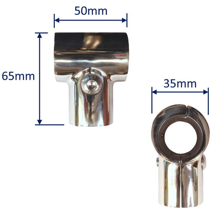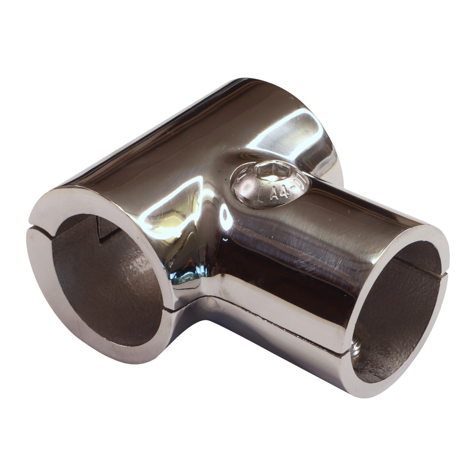 Stainless steel T-fitting, hinged in 2 parts for joining stainless steel tubing.  The T-fitting comes with an M8 clamping bolt and stainless steel grub-screws to secure the tubes in place.  Construct bespoke stainless steel frames for biminis, canopy frames, hood frames etc. using our stainless T-joint fittings along with our many other types of tube fitting.