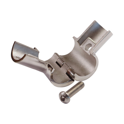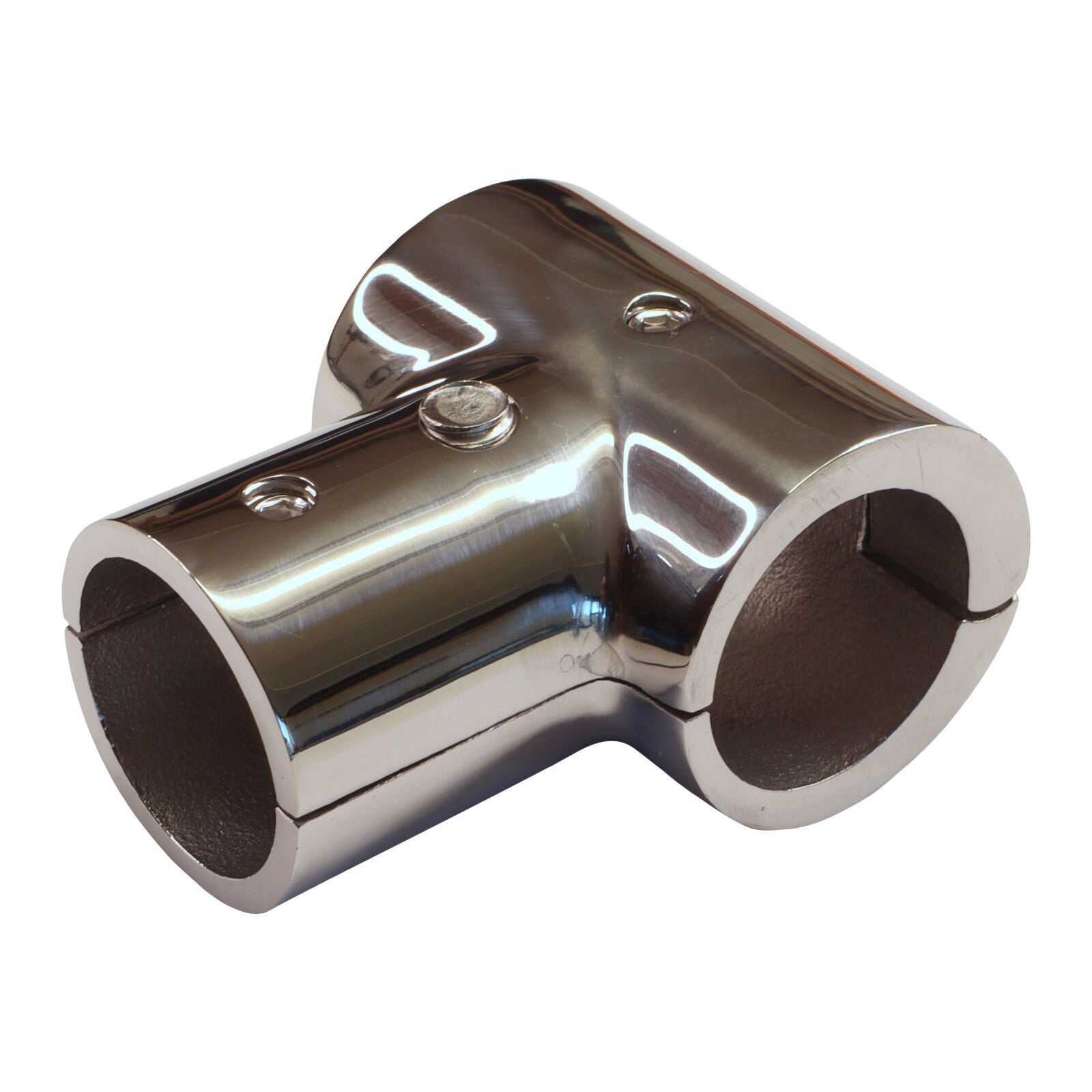 Use these stainless steel t-joints, hinged in 2 parts, to join stainless steel tubes at a 90-degree angle. The hinged 2-part construction allows these t-fittings to be clamped over an existing rail, to join a length of tube at 90 degrees.  Alternatively, use our one-part 90-degree T-fitting, to slide over the end of a tube where access permits.