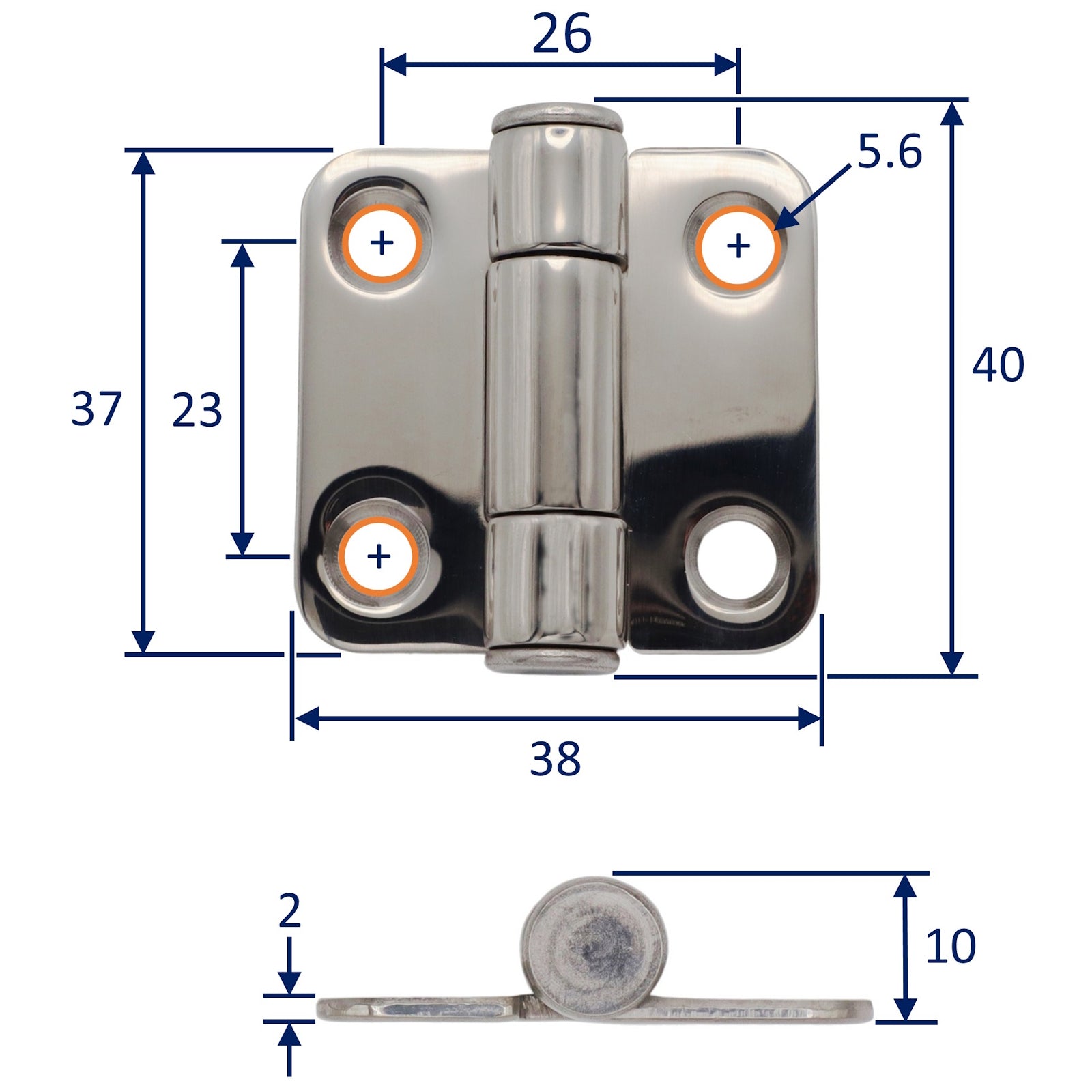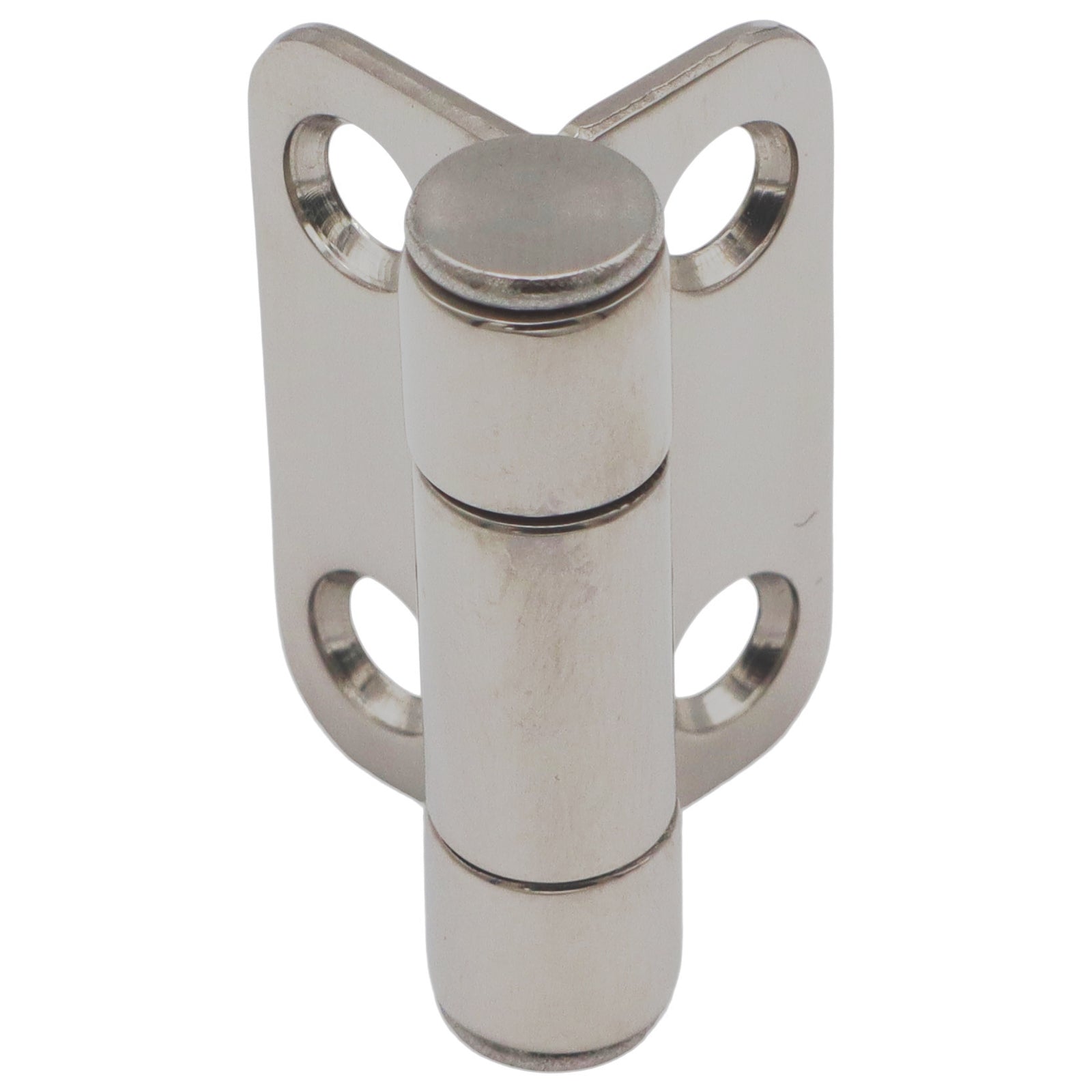 Stainless steel holding hinge, made from 316 stainless steel with a polished finish. Use these holding hinges, with built-in resistance to moving, in cases where you want the door / flap / hatch to stay in position.  Each hinge has a resisting torque (or moment) of 1.5 Nm (+/- 0.4 Nm)  As an example, one of these hinges would nominally support a weight of 1kg (a typical bag of sugar) at a distance of 15cm from the hinge pivot point.