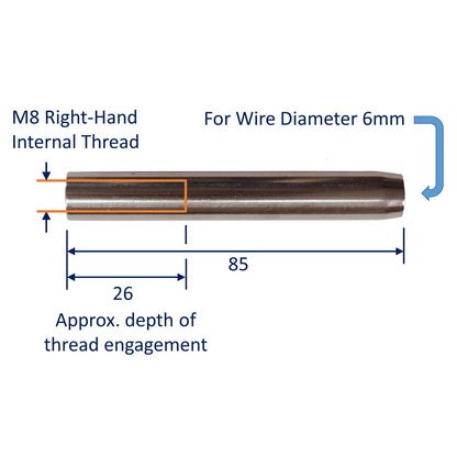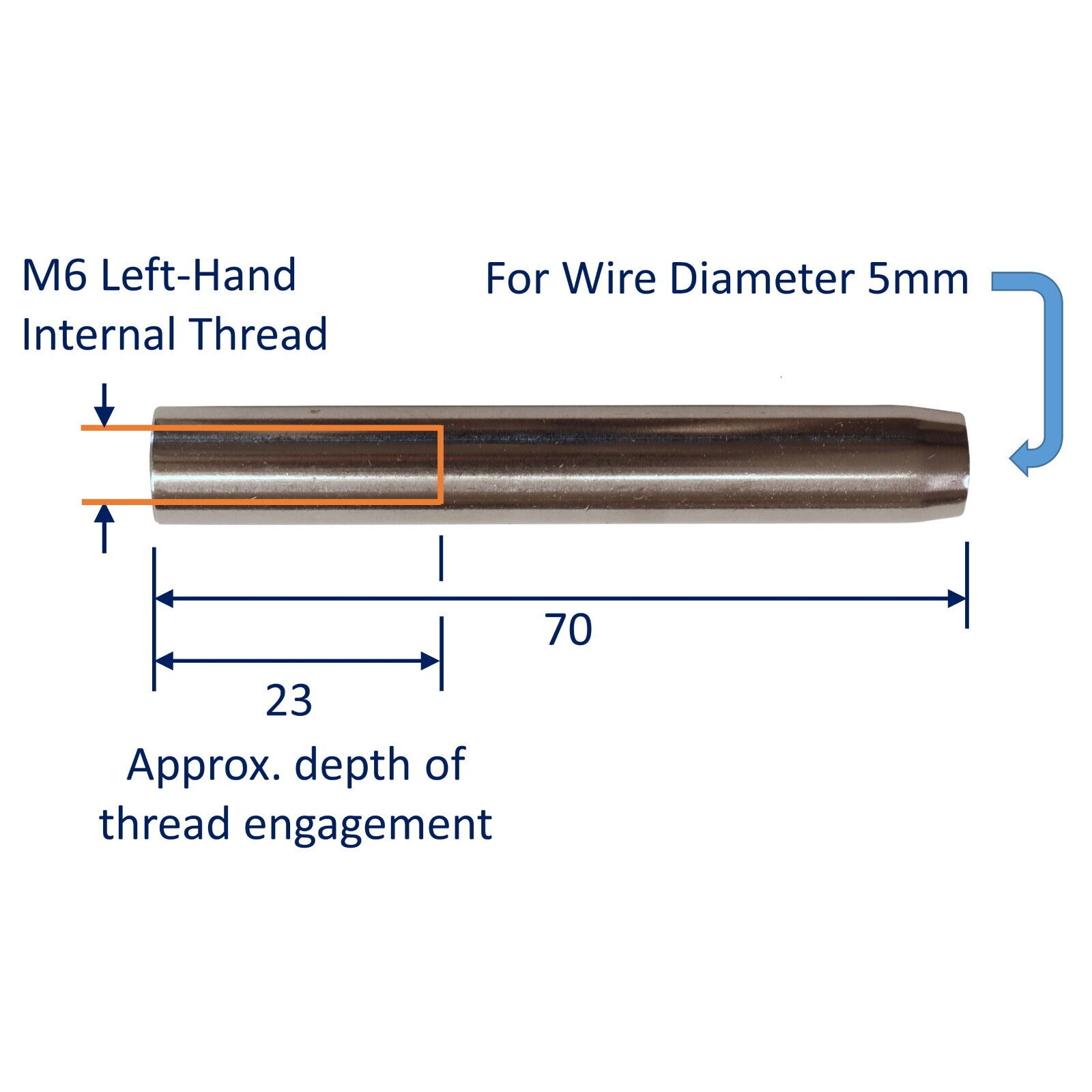 Swage end fitting for wire rope, made from 316 grade stainless steel.  These female threaded swage fittings come in a range of sizes for different wire-rope diameters, and a choice of threads, both left-hand and right-hand threaded versions are available.
