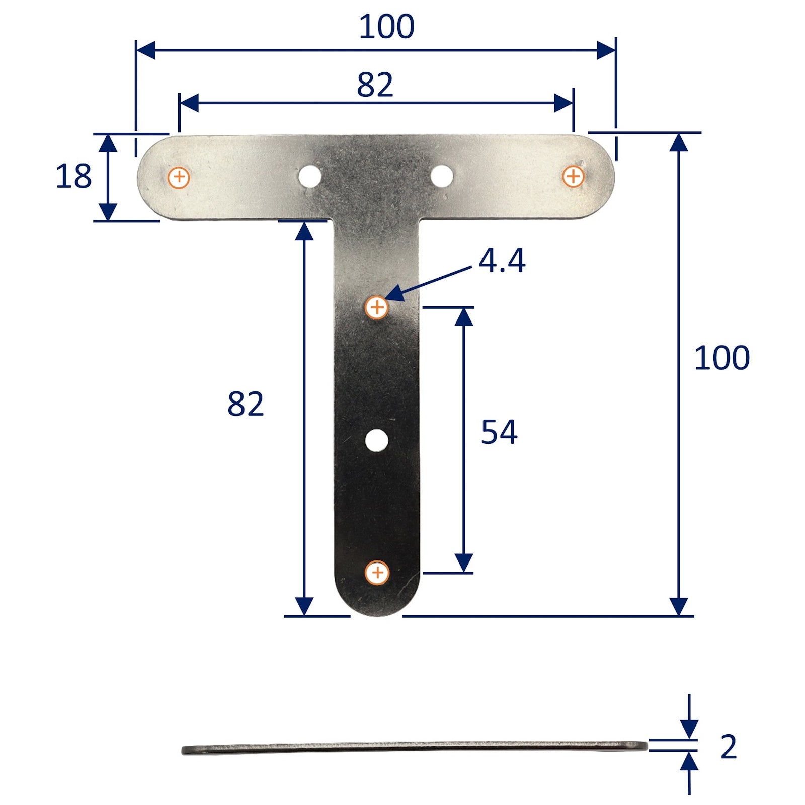Stainless steel T-shape bracket with countersunk holes for securing into place.  Manufactured in 2mm stainless steel these T shape brace plates are ideal for use around the boat, they will retain their appearance even in a marine environment.