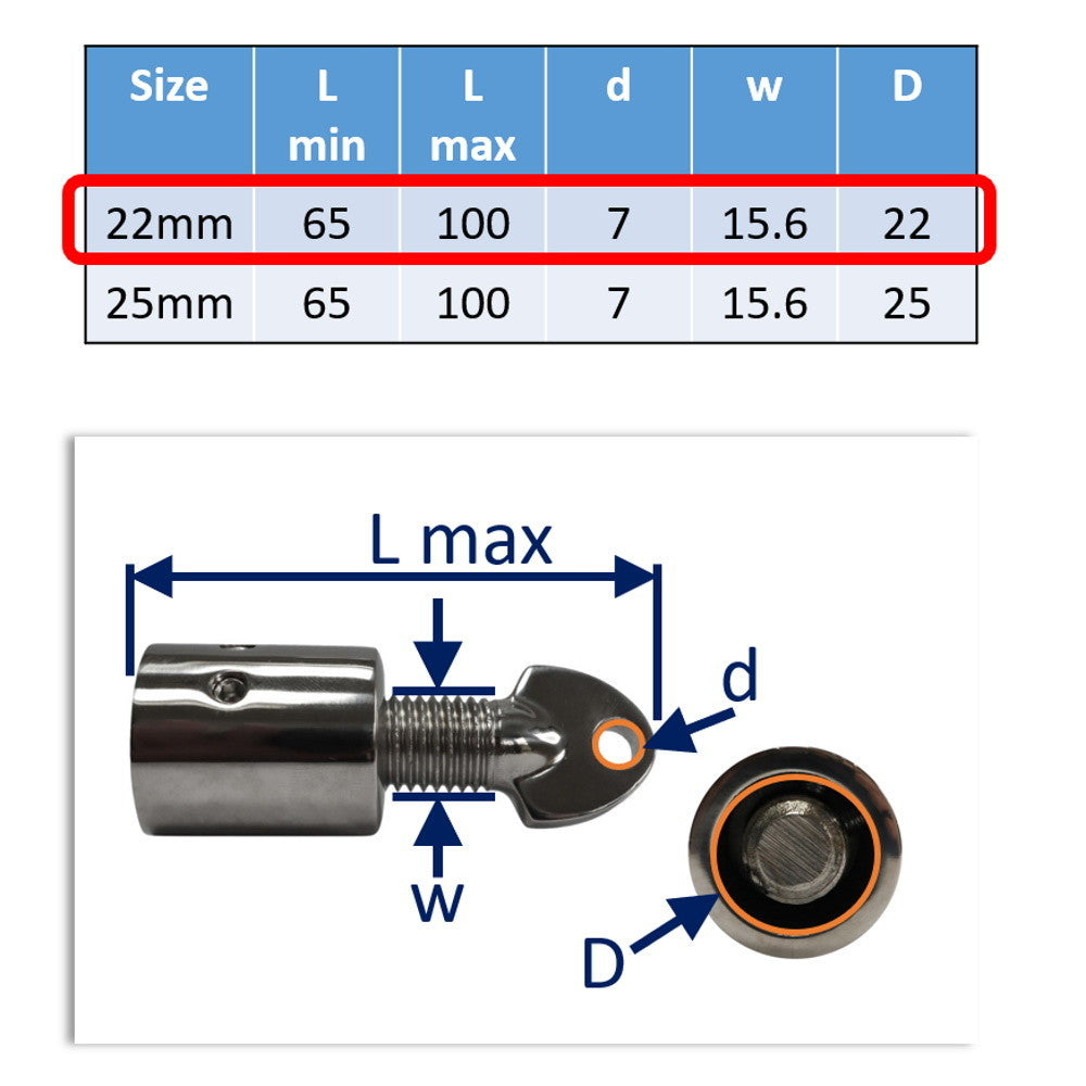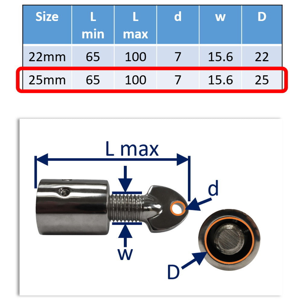 Tube end fitting, incorporating adjustable pivot point, for boat hood frames and bimini frames.  These 316 stainless steel tube end fittings are available in 2 sizes to suit tube diameters of 22mm and 25mm.  The fitting is attached to the tube end by simply tightening the grub-screws provided.