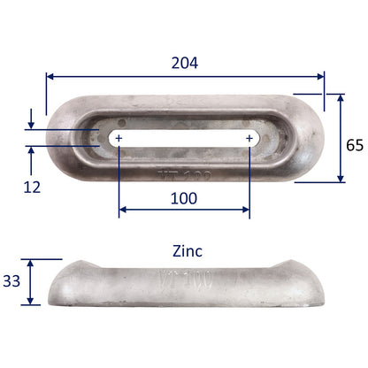 Zinc sacrificial anode, Vetus 100 type.  These hull anodes are for bolting to the hull.  Zinc anodes are suited to salt-water use, to prevent the galvanic corrosion of the metallic parts of your boat.  Anodes should be inspected yearly and replaced at the point that 50% or less remains.